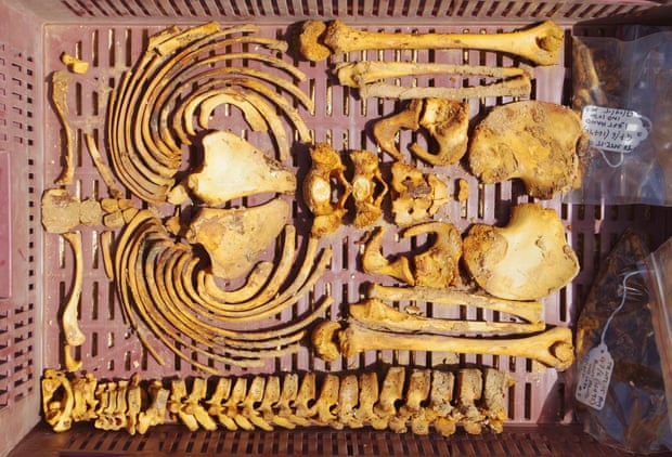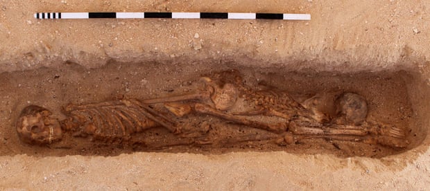| I resti di due adolescenti disposti uno sopra l'altro, con le teste alle estremità opposte (Foto: Mary Shepperson, Progetto Amarna) |